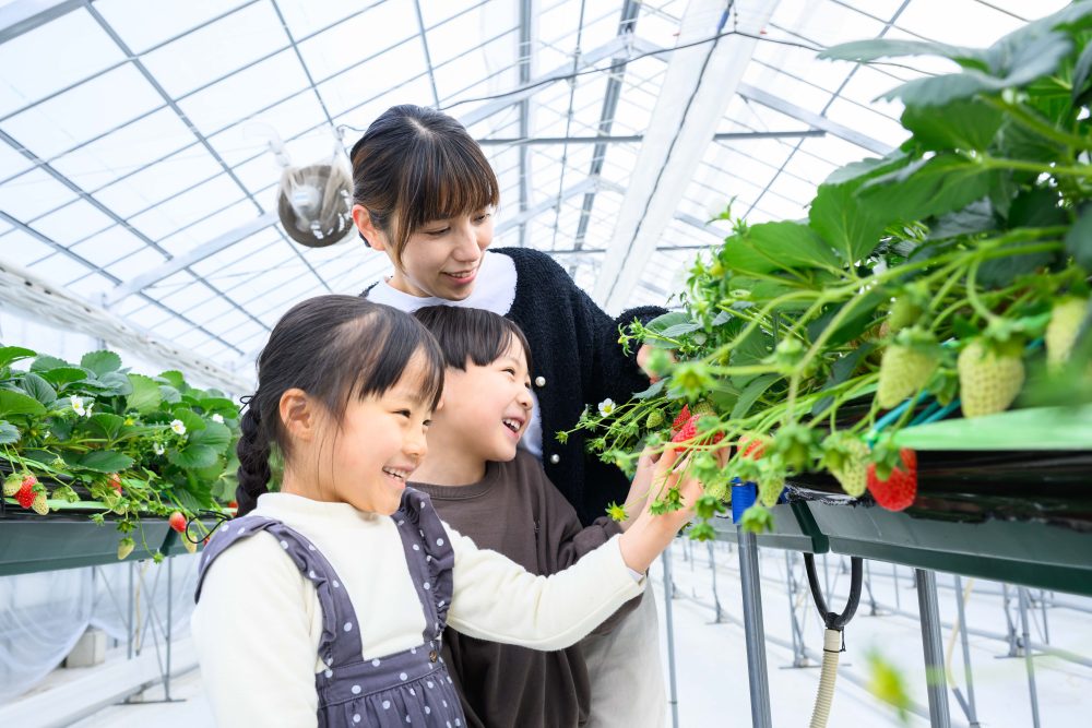 因为是高设栽培,所以草莓的采摘也很轻松,即使下雨也能安心享受。