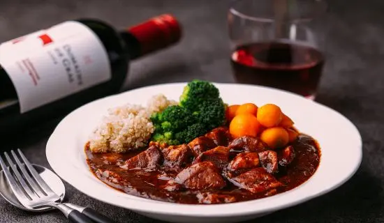 고기를 맛있게 맛보기 위한 지혜로부터 태어난 프랑스 전통요리 차분히 시간을 들여 최대한으로 끌어낸 쇠고기의 맛을 건강한 키누아와 함께 즐겨 주세요 곁들여진 인삼은 현지 된장으로 양념하고 있습니다.
